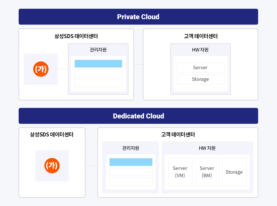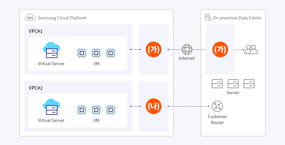 (나)를 통해 전용 회선 연결을 제공하고 On-premises 사설 네트워크를 Samsung Cloud Platform으로